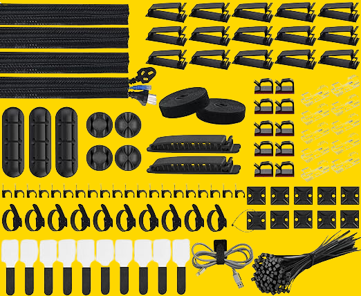 SOULWIT Cable Management Kit, 4 Cable Sleeve, 3 Silicone Cable Holder, 10+2 Roll Cable Organizer Straps, 15 Large Cord Clips, 100 Wire Organiser Ties for TV PC Under Desk Home Office